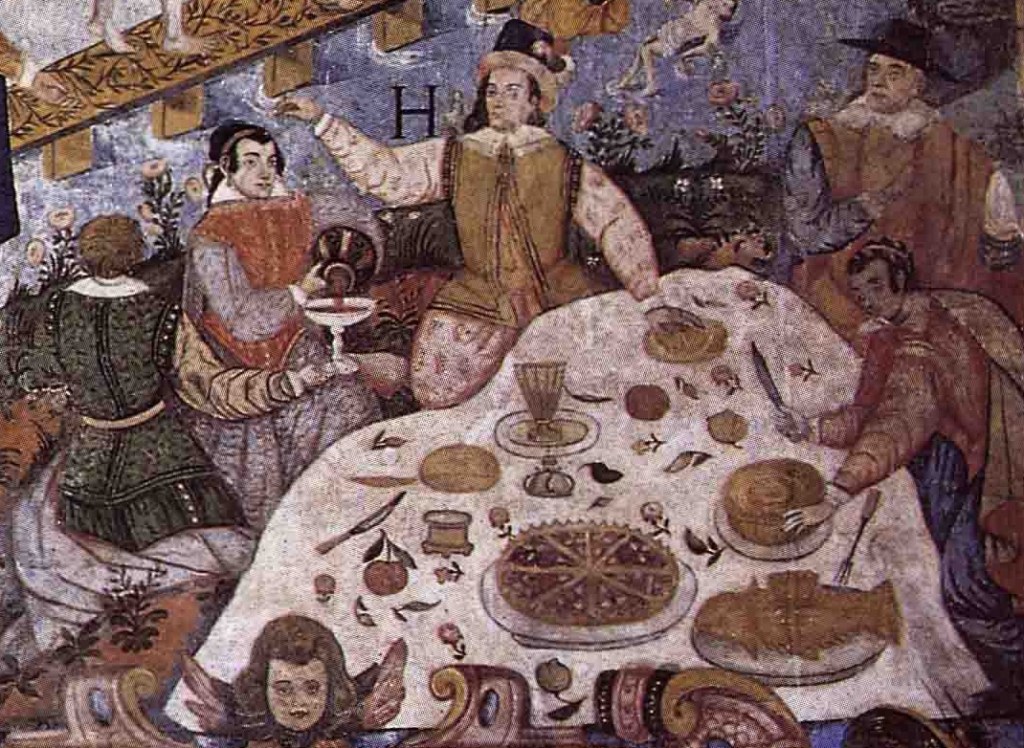 Luis de Riaño and Indigenous collaborators, The Paths to Heaven and Hell, detail of the feast, c. 1626 (San Pedro Apóstol de Andahuaylillas, Peru)