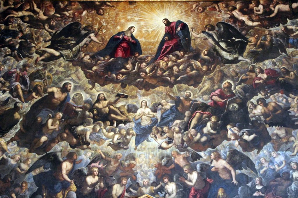 Jacopo Tintoretto (c 1518-1594) and Domenico Robusti, Paradise (E&I 298) (detail) (1588-1592), oil on canvas, 700 x 2200 cm, Sala del Maggior Consiglio, Palazzo Ducale, Venice. Image by Sailko, via Wikimedia Commons.